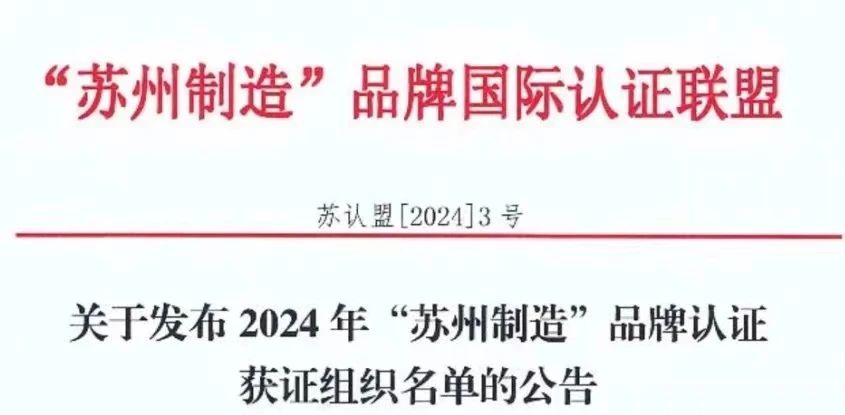 “苏州制造”品牌认证是采用国际通行的合格评定方式,依据标准进行市场化评价,具有自主创新、品质高端、信誉过硬、市场公认特性的高端质量品牌认证。